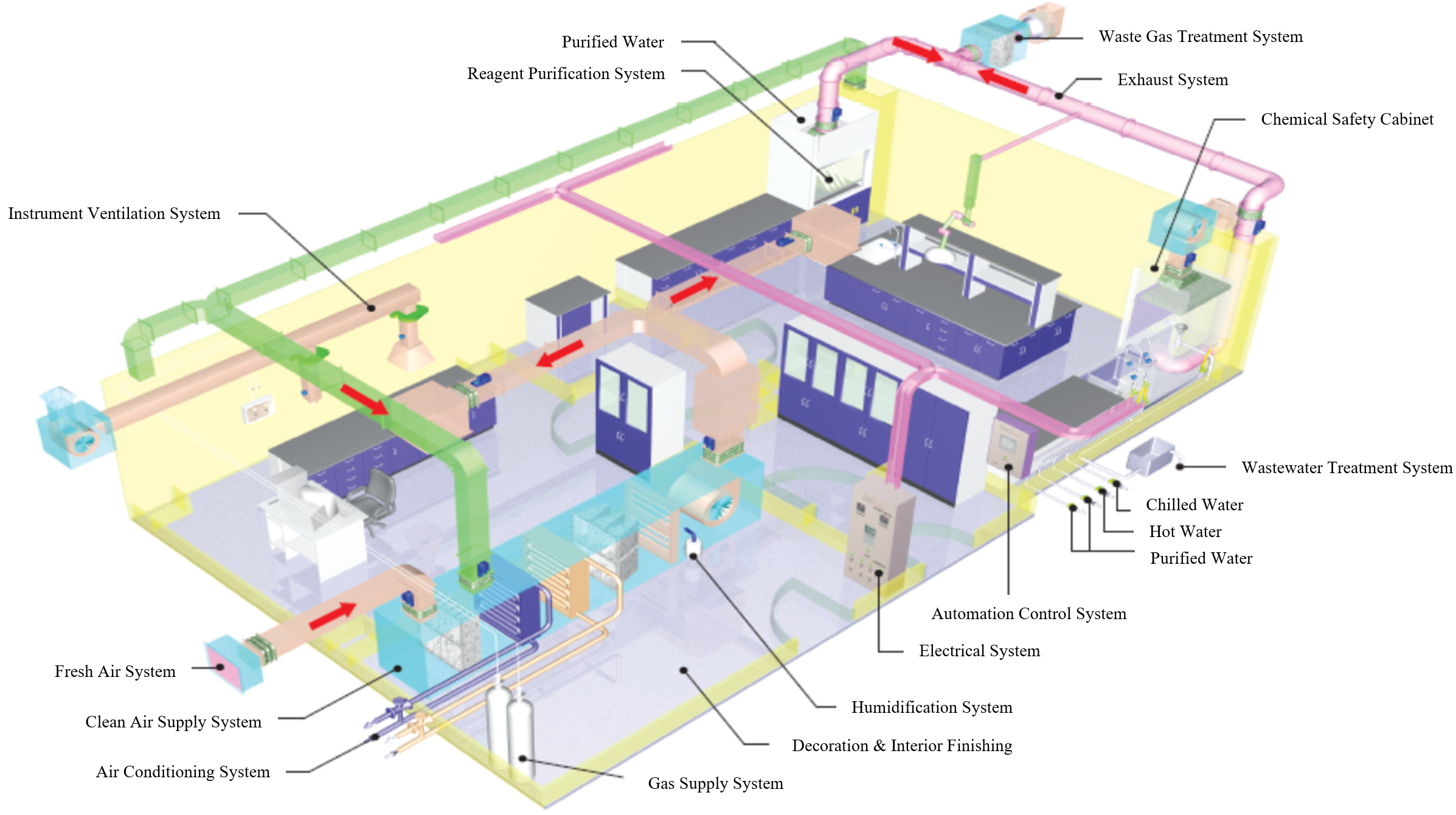 Lab design and planning is a complex and systematic engineering process involving multiple disciplines, requiring expertise in both laboratory operations and architectural knowledge as its technical foundation. Whether for new construction, expansion, or renovation projects, it is not simply about selecting the right instruments and laboratory furniture. A comprehensive laboratory master plan includes logical layout and floor plan design, as well as essential infrastructure such as electrical (high and low voltage), water supply and drainage, gas supply, ventilation, air conditioning, air purification, safety measures, and environmental protection systems.