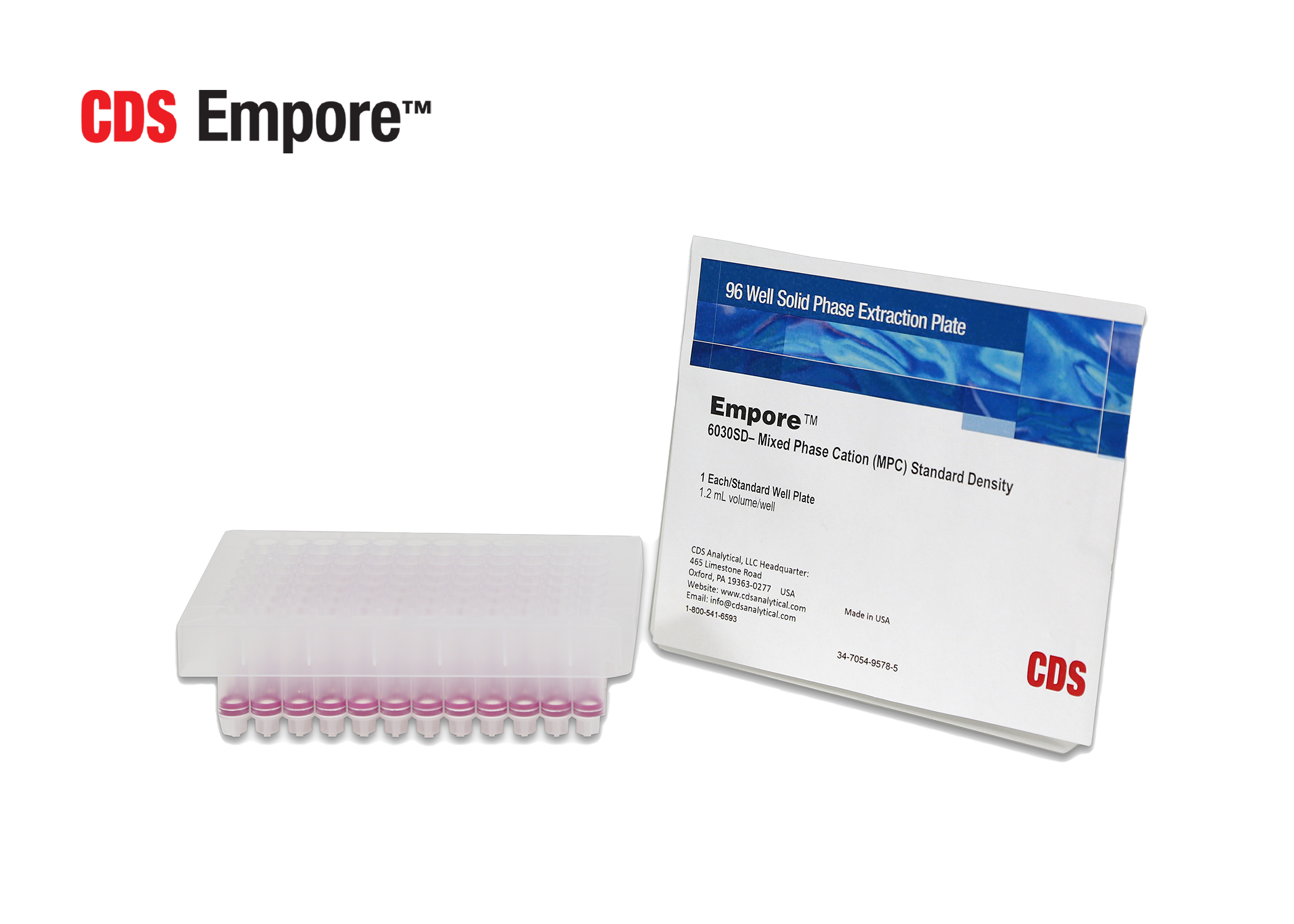 CDS Empore 6030/6330SD: Mixed phase cation bonded silica, 50um particle size. Combine good retention capacity with high recoveries. End-capped to minimize polar interactions. Recommended for moderate non-polar and ionized analytes extractions.