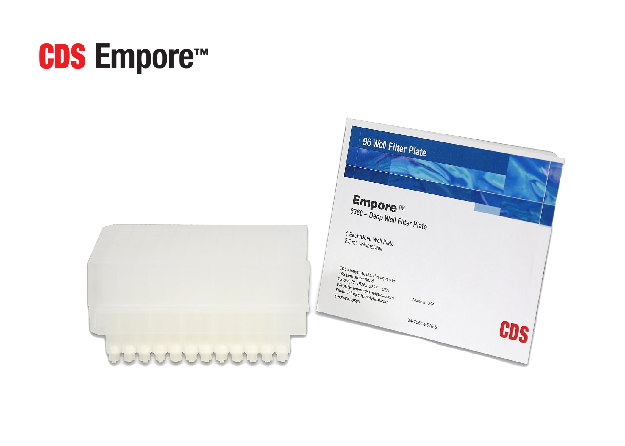 CDS Empore 6036: 96 Deep Well Filter Plates, polypropylene depth filter (5.5mm diameter). 2.5ml/well. 1 plate/EA. Good to remove visible particulates (>10um) from samples in the 96-well plate format (>98% removal), while maintaining excellent flow characteristics.